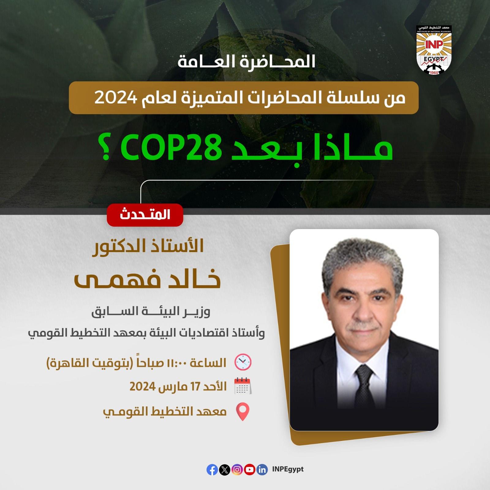 ماذا بعد الدورة الثامنة والعشرين لمؤتمر الأطراف في اتفاقية الأمم المتحدة الإطارية بشأن المناخ COP 28؟ للأستاذ الدكتور/ خالد فهمي، وزير البيئة السابق وأستاذ اقتصاديات البيئة بمعهد التخطيط القومي الأحد 17 مارس 2024 الساعة ١١:٠٠ صباحاً (بتوقيت القاهرة). بمقر معهد التخطيط القومي الحضور افتراضيا عبر منصة ZOOM على الرابط التالي: https://zoom.us/j/91439683457?pwd=Zm1UZ2kvQWYxMis2dDVoSFVwSlRzZz09