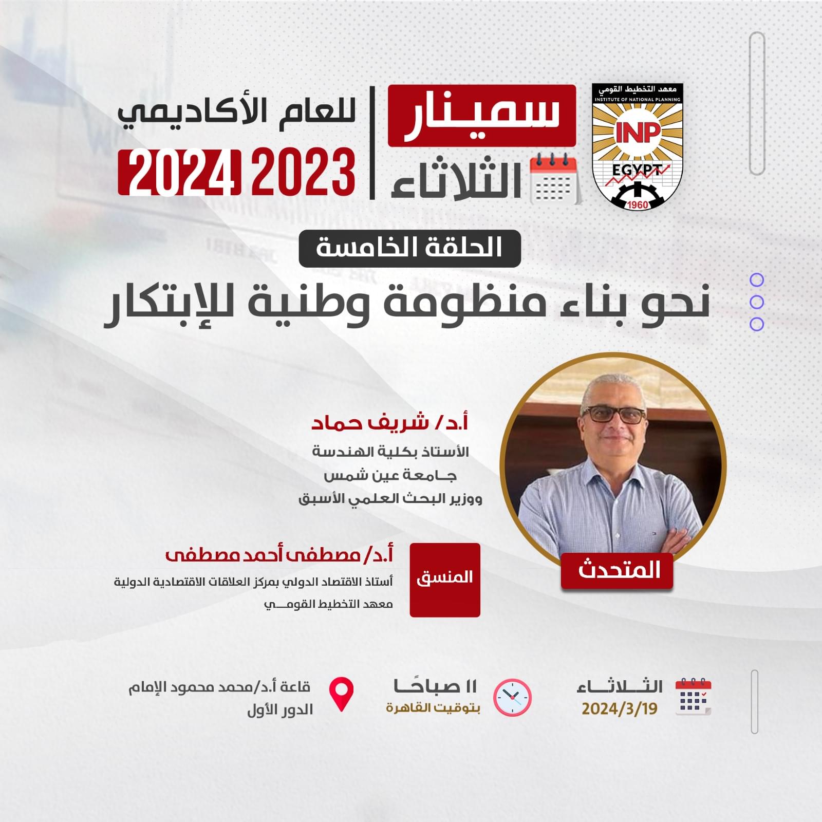 أ.د/ شريف حماد الأستاذ بكلية الهندسة جامعة عين شمس، ووزير البحث العلمي الأسبق الثلاثاء 19 مارس 2024م الساعة 11:00 صباحاً بتوقيت القاهرة (GMT+2) قاعة الأستاذ الدكتور/ محمد محمود الإمام - الدور الأول - مقر معهد التخطيط القومي لتسجيل الحضور: https://docs.google.com/forms/d/e/1FAIpQLSd73hVpDLP7B1W_WpEiJrwrPHElwAM6lM2k_1pcPF5l95L8Iw/viewform